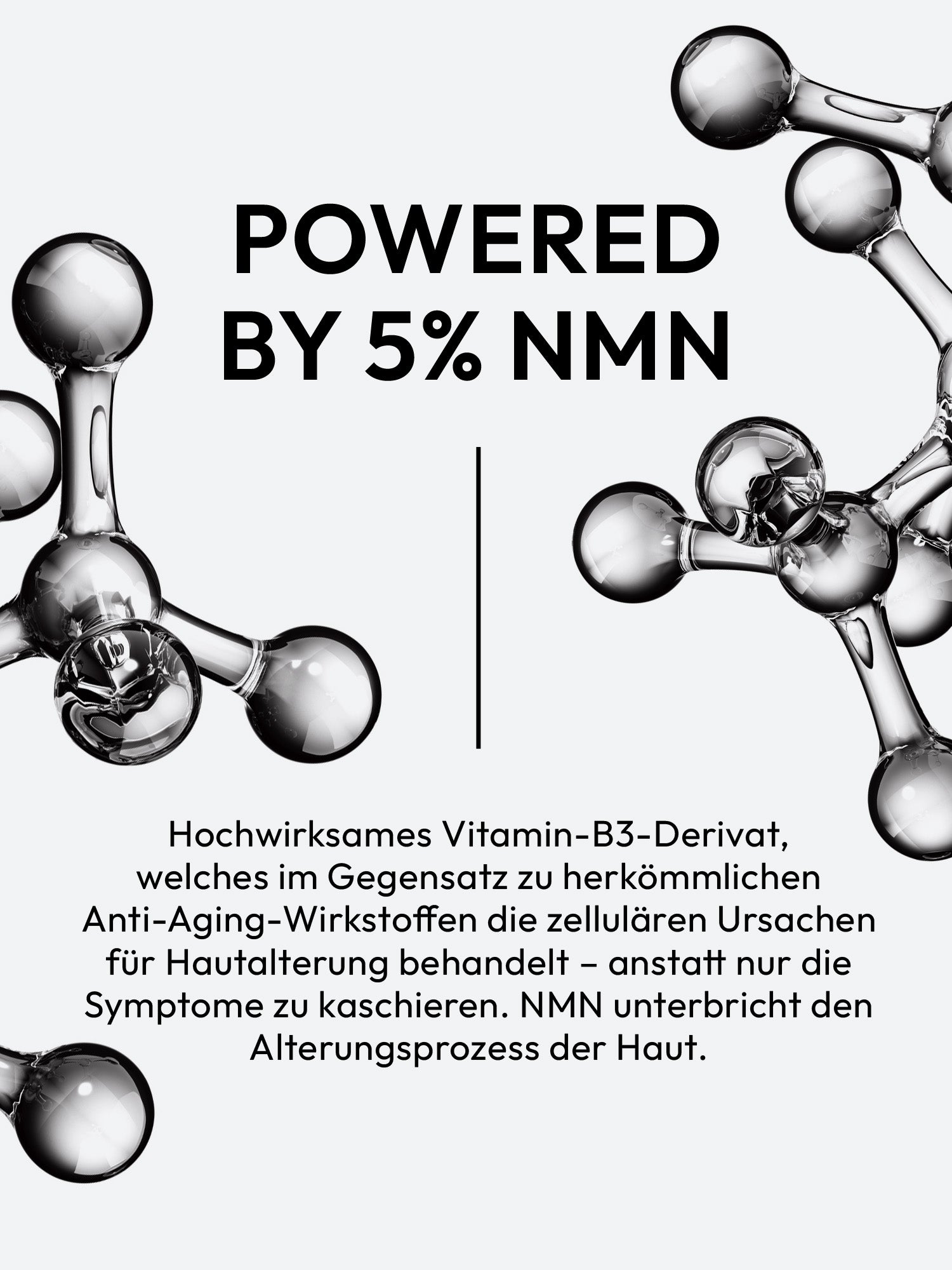 Behandelt die zellulären Ursachen für Hautalterung. Die Haut wird vor Zellschäden geschützt und der Alterungsprozess wird nachhaltig unterbrochen und verlangsamt. Darüber hinaus reduziert NMN sogenannte „Zombiezellen“ sowie Entzündungsmarker und unterstützt die DNA -Reparatur. Somit wirkt NMN nicht nur vorbeugend, sondern zusätzlich reparierend und regenerierend und minimiert bereits bestehende Zeichen vorzeitiger Hautalterung.